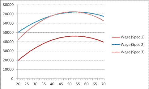 Sample age-wage profiles are shown below, for a white male with just a high-school diploma, unmarried, neither immigrant, veteran nor union member. The estimated peak earning year is 53 in Specification 1, 54 in Specification 2, and 52 in Specification 3.