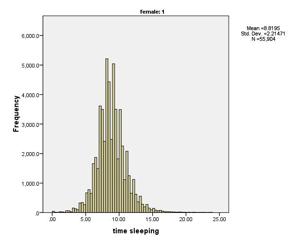 So it looks like a lot of the variation is in the left tail: men are more likely to forego sleep than women, but the upper percentiles get about as much sleep. These histograms are: