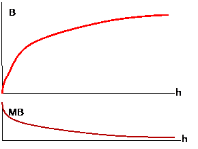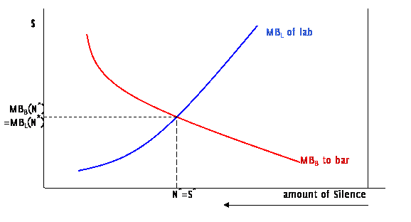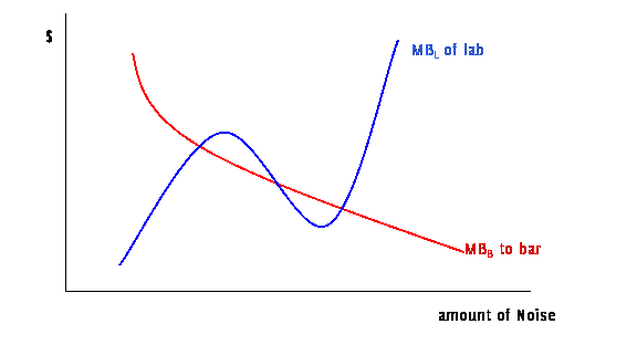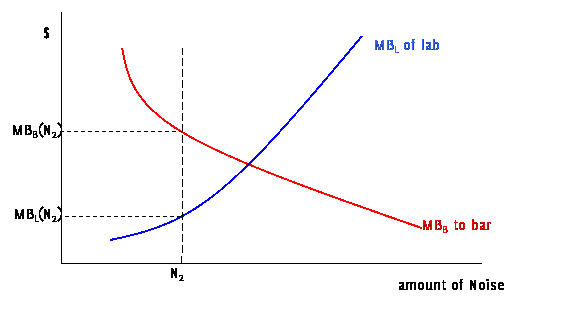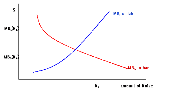 Consider the case of two neighbors sharing a building. One is a bar, which, in the course of ordinary business, produces loud music and loud people. The other is a laboratory which operates best without noise or vibrations; as these levels increase the lab must spend more money to shelter its experiments. Starting from zero noise, the bar gets a significant marginal benefit (MB) from the first few decibels of noise, however the marginal benefit falls as the level of noise rises. The lab can, with low cost, abate low levels of noise but its costs rise as it tries to abate more and more noise. Costs avoided are net benefits so we can consider this as a marginal benefit to the lack of noise: a small lack of noise has a small marginal benefit but as the noise rises the marginal benefit rises. So we can draw their respective marginal benefits (MBL to the lab and MBB to the bar) to different levels of noise (N):