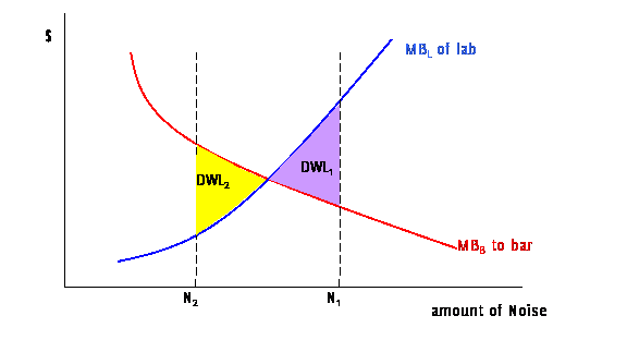 If the amount of noise were at cacophony N1, then there would again be an incentive for trading: the bar could make a profit since it could reduce noise at only a small cost while the lab would be willing to pay a large amount for that reduced noise. If the noise were at a whisper, N2, then the bar would find it profitable to emit more noise, and the lab could not "outbid" it since the bar would demand a high price of MBB(N2) while the lab would only be willing to pay MBL(N2).