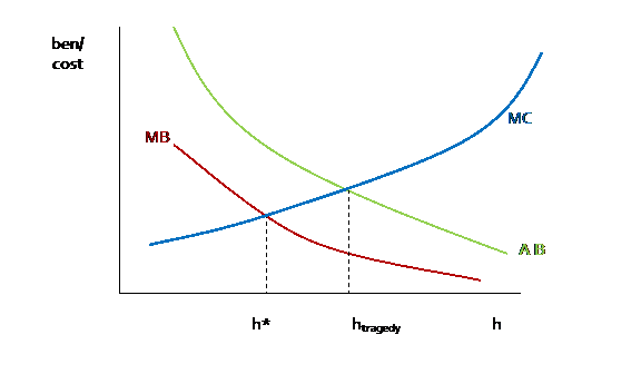 From this it is straightforward to additionally note that, over time, the net increase or decrease in the available benefit is changed by different 'harvest' policies: over-hunting today (if htragedy is greater than the breeding rate) leads to lower hunting possibilities tomorrow, until the animals are killed off entirely.