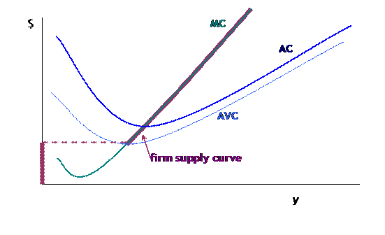 The firm's supply curve is then the locus of price and quantity choices, which is the firm's MC curve above AVC, then quantity jumps to zero if the price falls below this point. In the graph, this is: