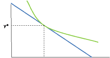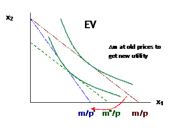 In the picture above, the price of x1 rises from p to p'. After the price change, the consumer would need m' income to get to the original indifference curve. (Note that this is the Hicks substitution effect so the addition to income would be less than the Slutsky.)