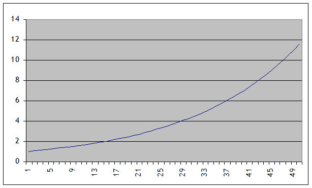 Outside finance, the macroeconomists probably make the greatest use of ex and ln(x), because of the connection with growth. Suppose that an economy's GDP grows at 5% per year, every year, for 50 years (assuming continuous compounding, so that by the end of the 50 years, it's grown to nearly 12 times its original size. A graph of raw GDP would look like this (starting at 1):