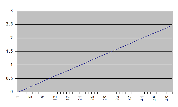 shooting up to ever-larger values, quickly becoming difficult to work with. (For instance, can you tell, just from the graph, how big the economy is after 25 years? It's somewhere between 2 and 4 times as big as it started, but that's about all that you could tell.) So taking the natural log of GDP would return a nice series like this: