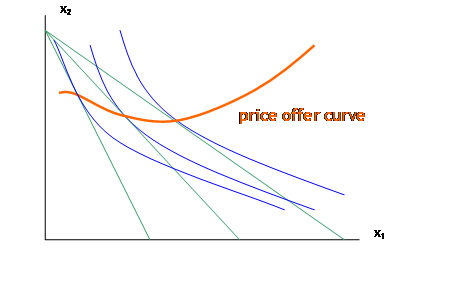 b. Now if we keep income constant but instead change p1, we can observe how the consumer's choice of bundles change. Linking these together gives us the price offer curve: