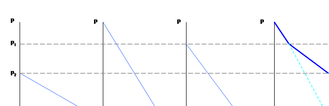 At a price above P1, only person B is in the market, so the market demand is just her demand. At a price lower than P1 but above P2, a reduction in price will prompt both B and C to demand the good. At a price lower than P2, all three people A, B, and C, are in the market. So a reduction in price induces all three to demand more. The market demand curve becomes more elastic since now a fall in price means ΔxA + ΔxB + ΔxC. The market elasticity arises both from intensive changes (each person's demand changes) and extensive changes (people enter or leave the market in response to price changes).