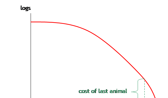 Make the (not entirely serious) assumption that we have some units to measure "animals" and "logs". Starting from a value of zero logs and all animals, suppose we reduced the number of animal units by one? How many more logs could we get? This gives the opportunity cost of the last unit of animals.